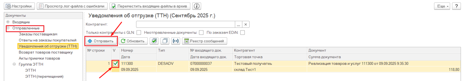 Теперь можно произвести поставку товара по полученному заказу. Чтобы отправить подтверждение отгрузки, необходимо перейти на ветку "Отправленные"->"Уведомления об отгрузке", найти необходимый документ (тип DESAVD), отметить его галочкой, отправить, нажав на соответствующую кнопку.