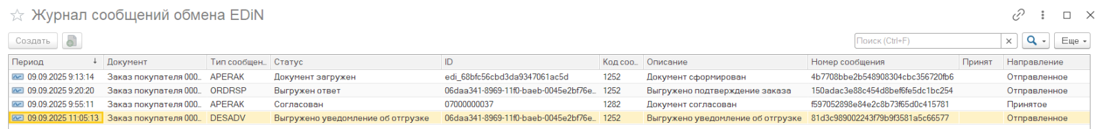 После получения и загрузки Уведомления об отгрузке в учетной системе покупателя, поставщику также необходимо получить и зарегистрировать служебные сообщения в своей учётной системе. Если регистрация прошла успешно, пиктограмма для данного документа изменится на конечную успешную .