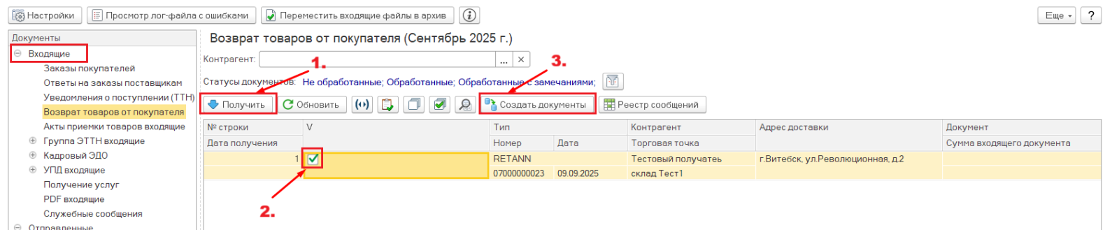 Примечание: если покупатель и поставщик работают по электронным накладным, возврат осуществляется по электронной накладной и приходит на ветку "Входящие"->"Группа ЭТТН входящие"->"ЭТТН входящие (возвраты)".