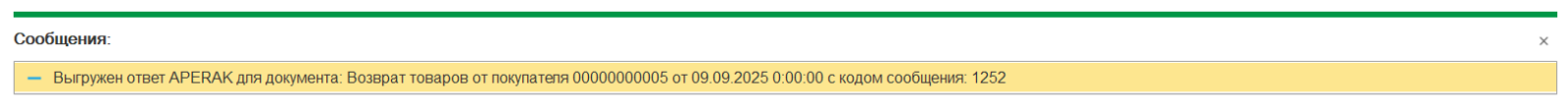 Создается документ "Возврат товаров от покупателя". Из учетной системы выгружается необязательное служебное сообщение с кодом 1252.