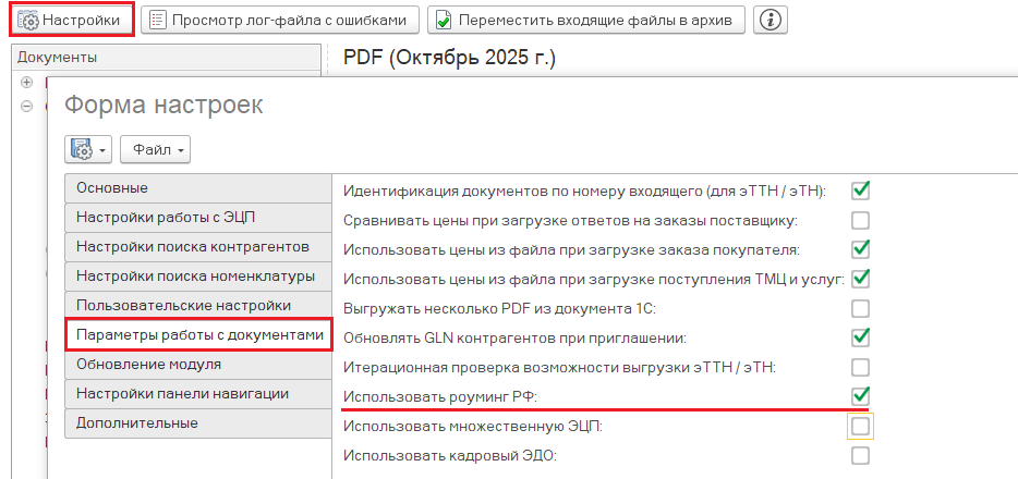 Перед отправкой документа необходимо пригласить контрагента-нерезидента, настроить роуминг и создать документ. Также следует проверить настройки модуля: на вкладке «Параметры работы с документами» должен стоять флаг «Использовать роуминг РФ».