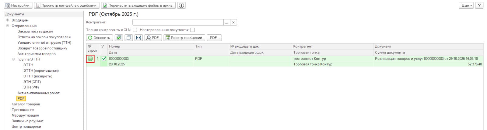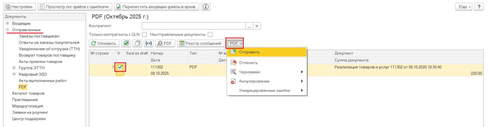 После выполнения всех подготовительных действий, можно отправить созданный документ. Отправка выполняется с ветки “Отправленные->PDF” по кнопке "PDF"->"Отправить".
