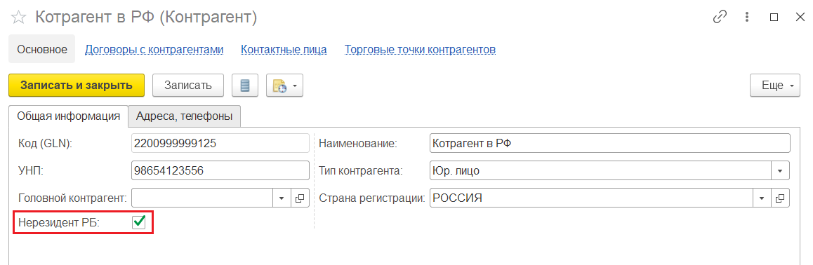 Наличие признака нерезидента в карточке контрагента является обязательным условием успешной выгрузки документа в роуминге с РФ. На примере стандартного модуля для 1с8 это выглядит следующим образом: