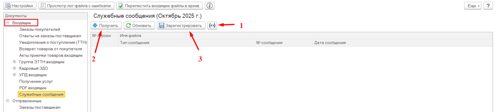 Далее Отправитель получает служебное сообщение о доступности документа получателю и регистрирует его в учетной системе. Для этого необходимо перейти на ветку "Входящие"->"Служебные сообщения", затем выбрать период, нажать "Получить", "Зарегистрировать".