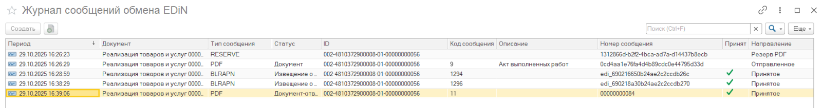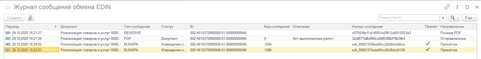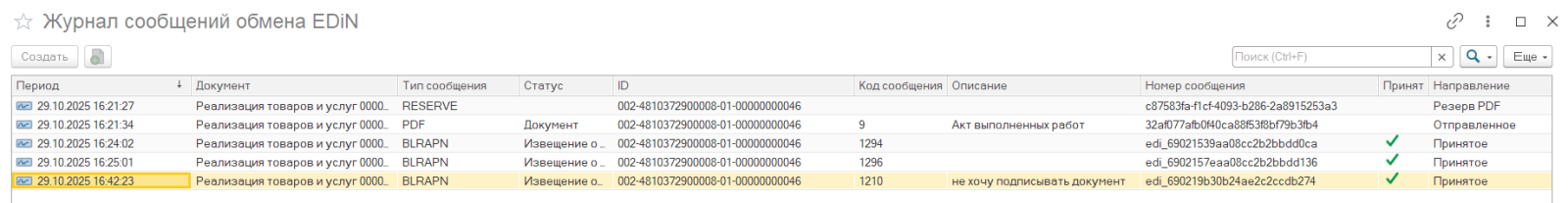 Реестр сообщений по отправленному документу, который ожидает подписание, имеет следующий вид: