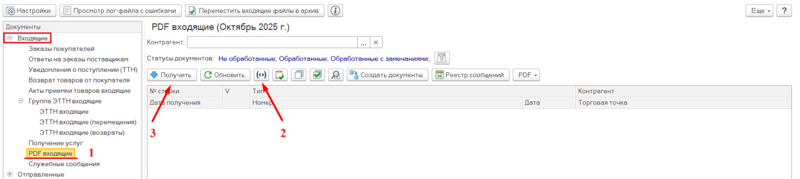 Для подписания входящих документов необходимо перейти на ветку "Входящие"->"PDF входящие", установить необходимый период, нажать на кнопку "Получить".