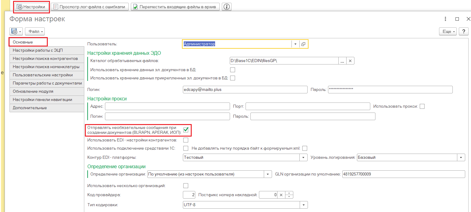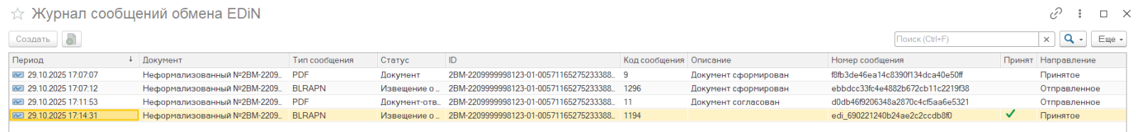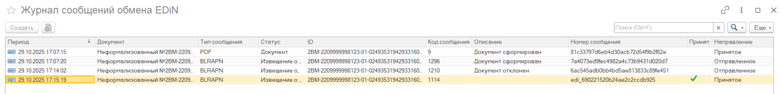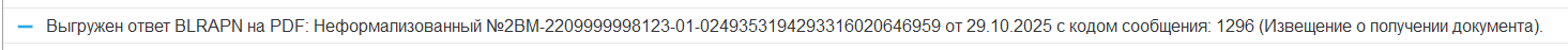 Если в модуле настроена выгрузка необязательных служебных сообщений, после успешного создания документа будет выгружено служебное сообщение с кодом 1296.