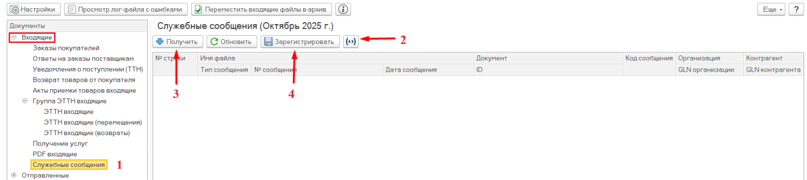 Далее необходимо получить и зарегистрировать служебные сообщения на ветке "Входящие"->"Служебные сообщения", предварительно выбрав необходимый период времени.