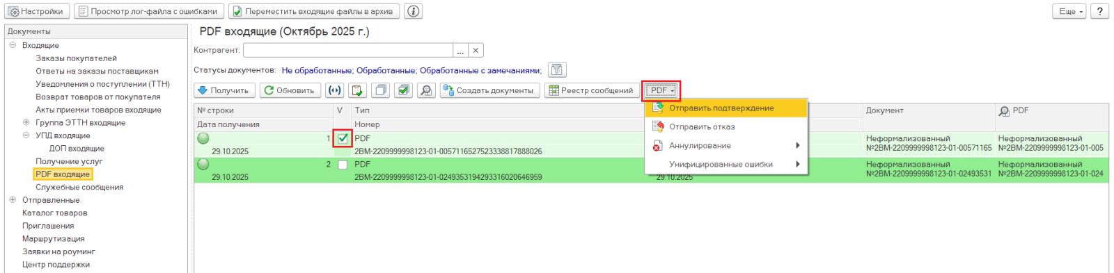 1. Для подписания документа необходимо выбрать документ и нажать на кнопку "PDF" –> "Отправить подтверждение".