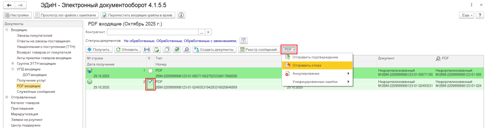 2. Чтобы отказаться от подписания, необходимо выбрать документ, нажать на кнопку "PDF", затем "Отправить отказ".