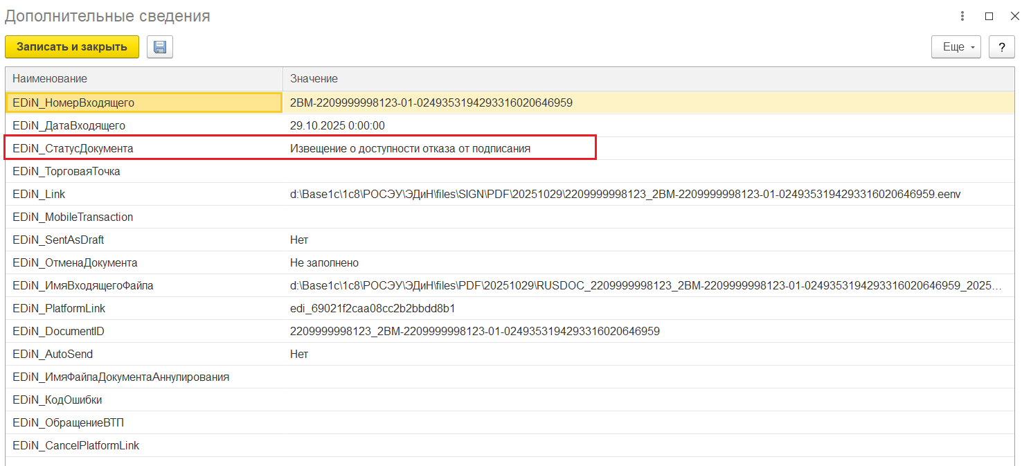 После успешной отправки отказа следует получить и зарегистрировать служебные сообщения. Пиктограмма документа изменится на: