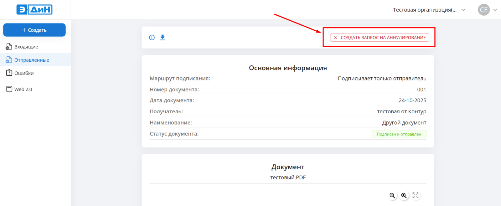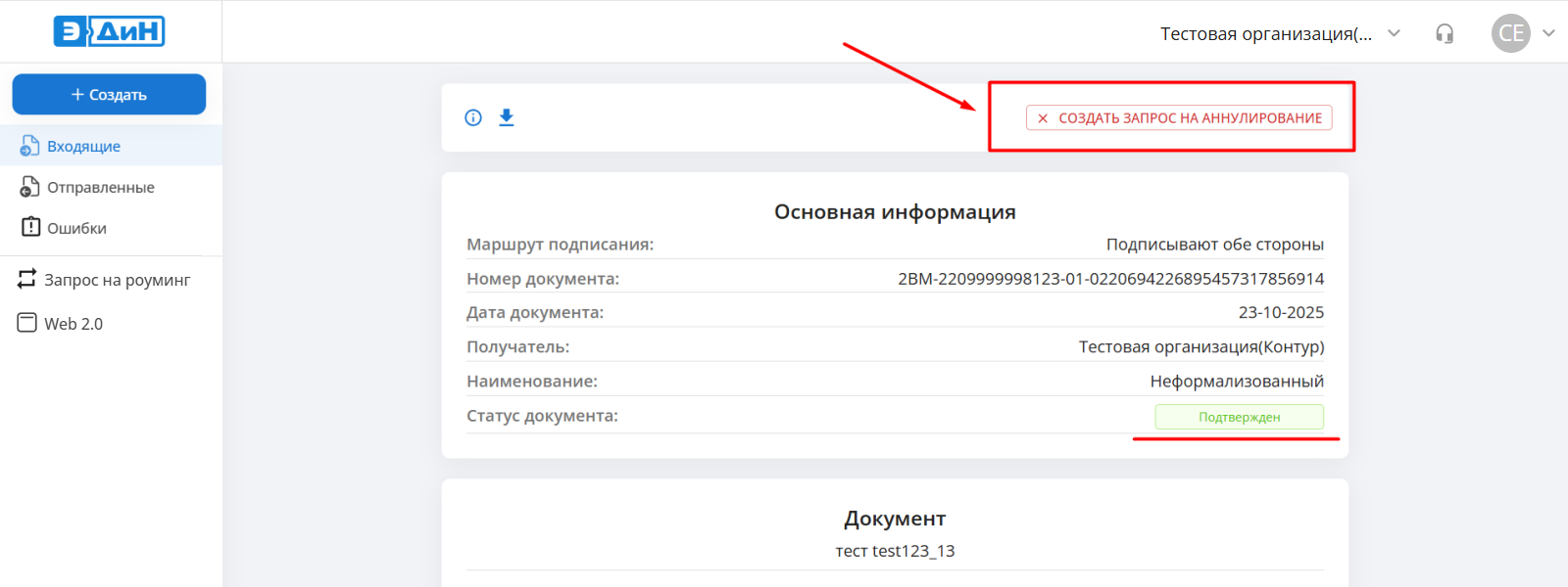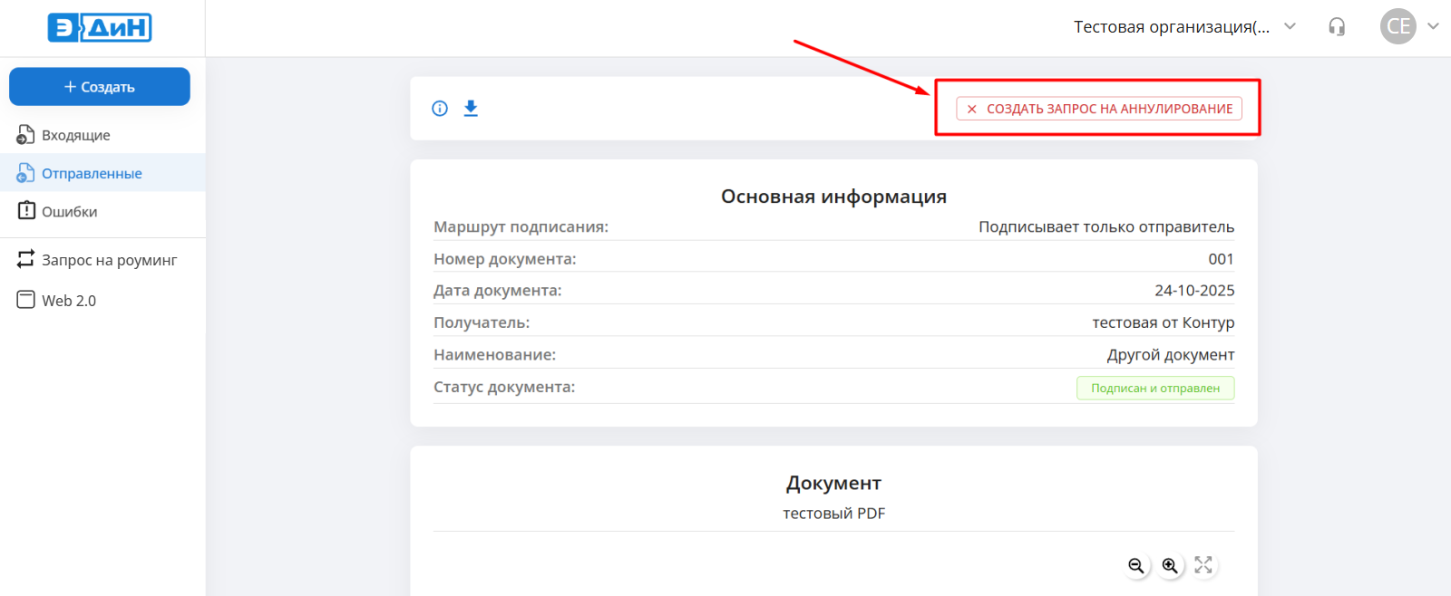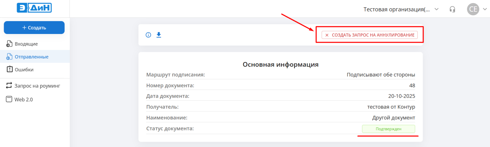 Создать запрос на аннулирование можно по исходящему документу с односторонней подписью, который находится в статусе “Подписан и отправлен”.