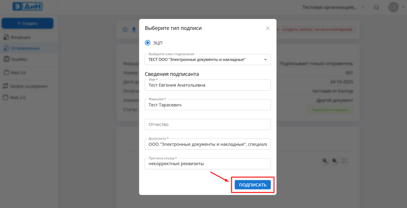 Получатель так же может отклонить запрос на аннулирование и тогда документ снова перейдет в статус "Подписан и отправлен"