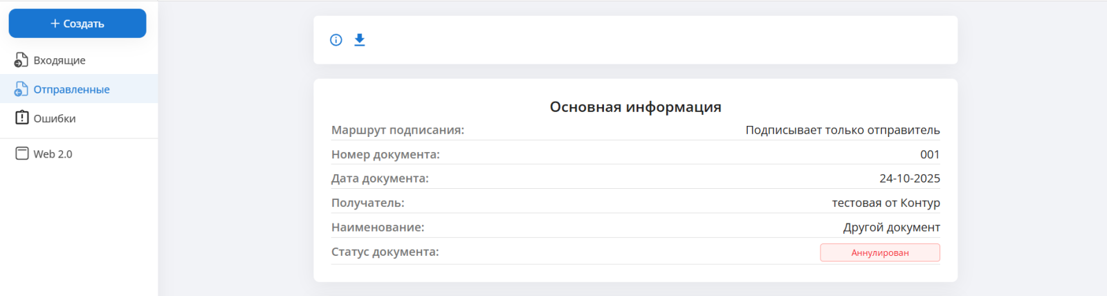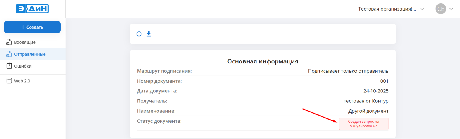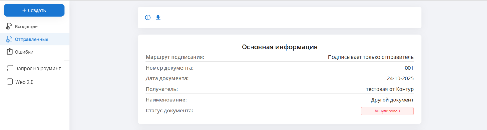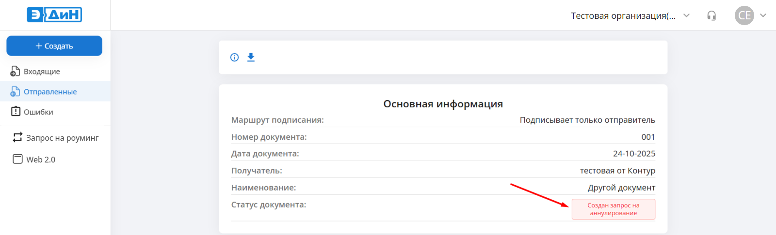 После того, как получатель подтвердит запрос на аннулирование, документ перейдет в статус “Аннулирован”.