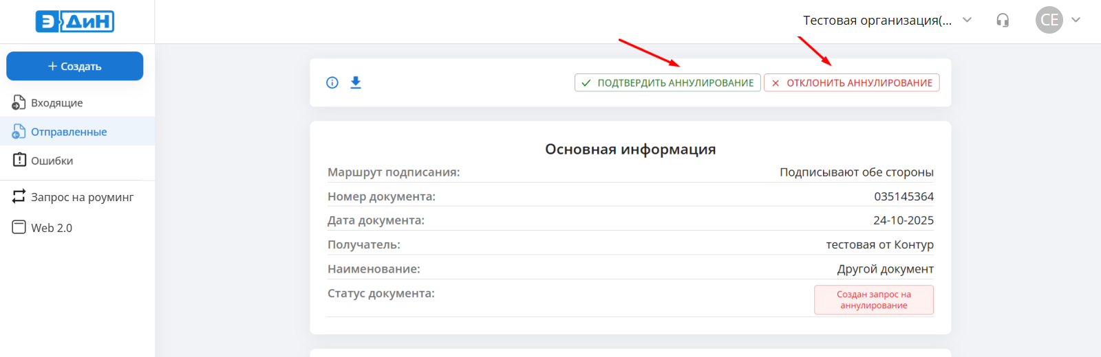 Если Ваш контрагент отправил запрос на аннулирование по документу и он находится в статусе "Создан запрос на аннулирование" Вы можете Подтвердить аннулирование, в таком случае документ перейдет в статус "Аннулирован" или Отклонить аннулирование и Ваш документ перейдет в предыдущий статус ("Подписан отправителем", "Подписан и отправлен", "Подтвержден")