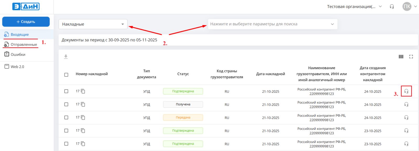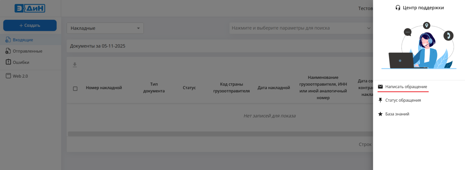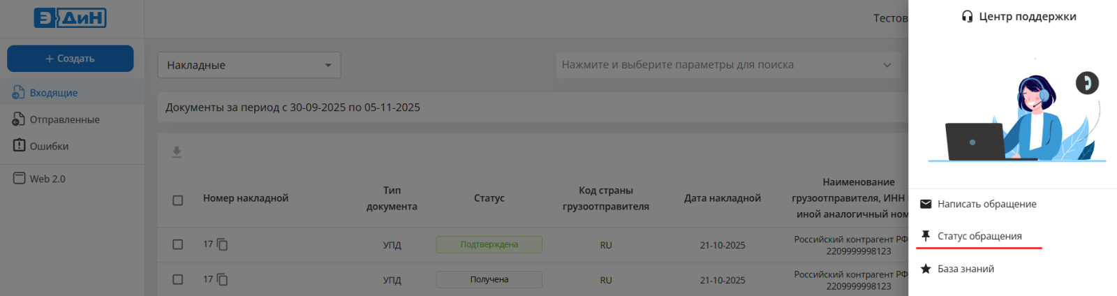 Можно оставить заявку из раздела "Входящие" или "Отправленные". Для этого необходимо перейти в соответствующий пункт меню, найти там документ, по которому возник вопрос, воспользовавшись фильтром для поиска. Нажать на значок Центра поддержки в строке с наименованием документа.