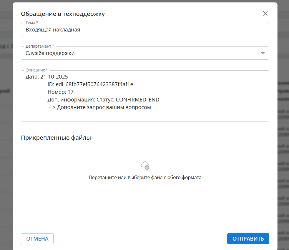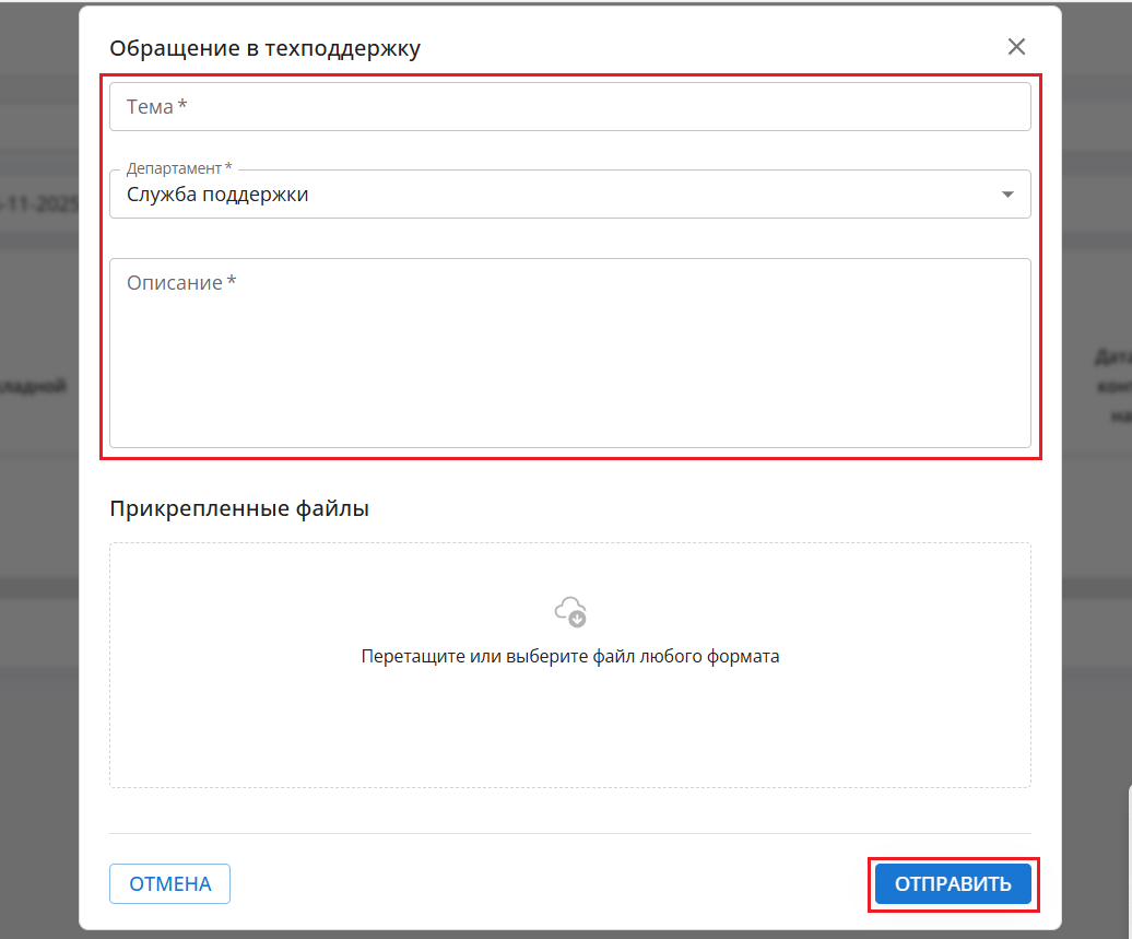 Откроется окно для создания обращения в Техническую поддержку. Здесь необходимо заполнить обязательные поля: Тема, Департамент, Описание (текст, описывающий проблему). Максимальная длинна наименования поля Тема составляет 150 символов. По нажатию на поле "Прикреплённые файлы" можно выбрать и прикрепить дополнительные файлы, которые помогут описать суть вопроса более подробно, или перетянуть их в данное поле (например, с рабочего стола). Для отправки заявки необходимо нажать на кнопку "Отправить".