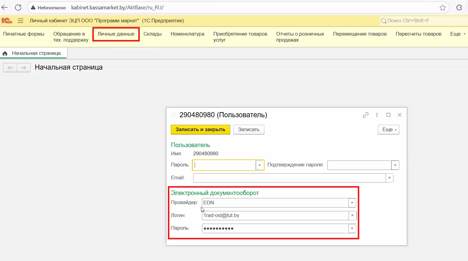 - При первом подключении ввести логин и пароль от личного кабинете сервиса ЭДиН