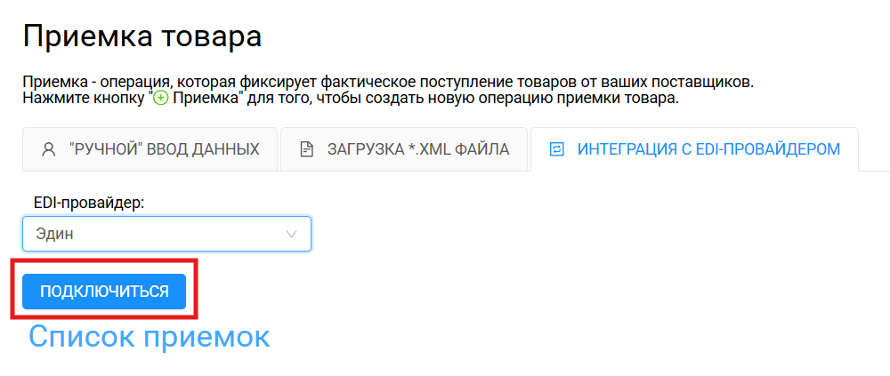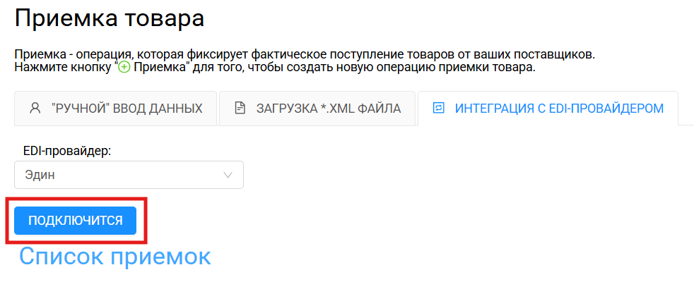 - В вариантах приемки выбрать “Интеграция с EDI-провайдером” и выбрать ЭДиН.