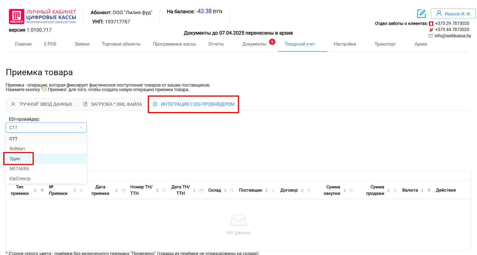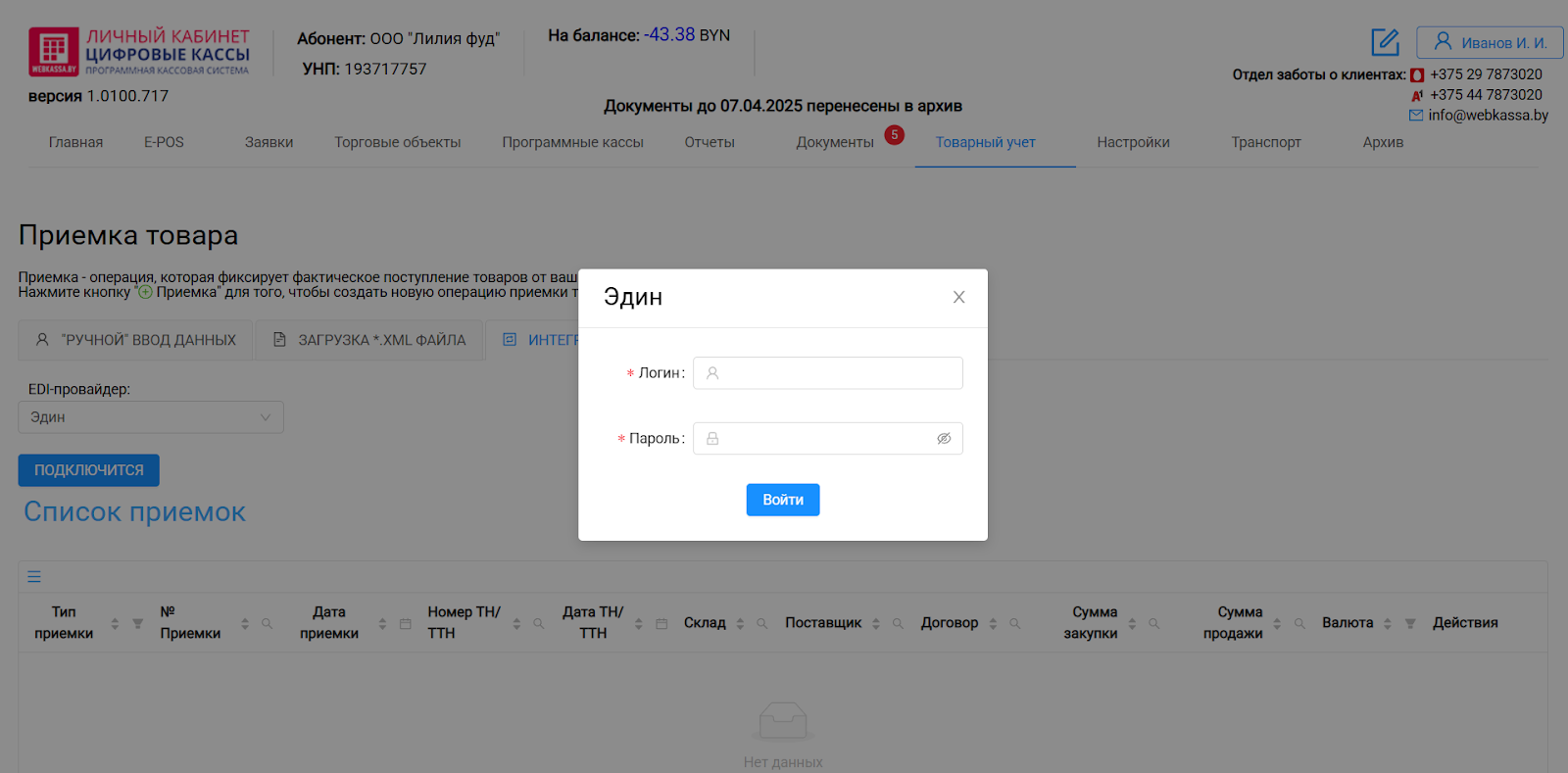 - действующий договор с ЭДиН для работы с электронными накладными;
