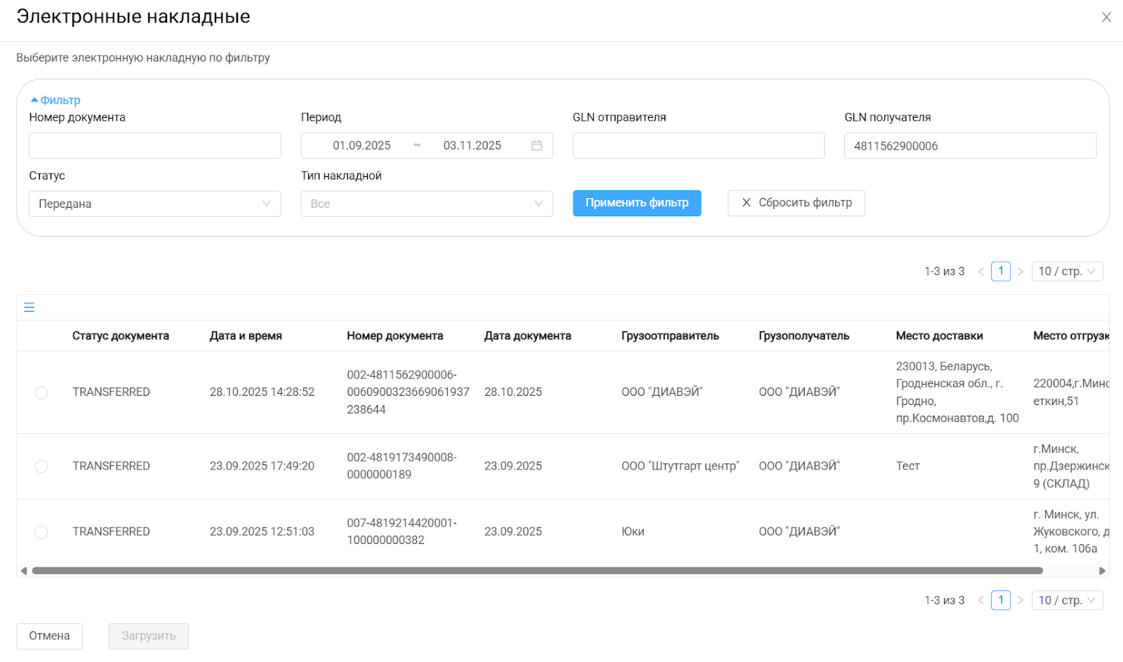 * Примечание: если пользователь в сервисе ЭДиН “привязан” к нескольким организациям, то в фильтре необходимо также указать GLN организации - получателя электронных накладных, которые необходимо загрузить.
