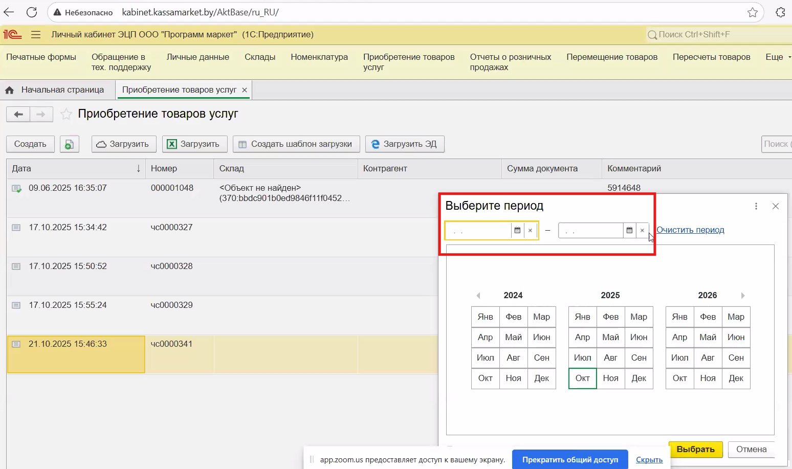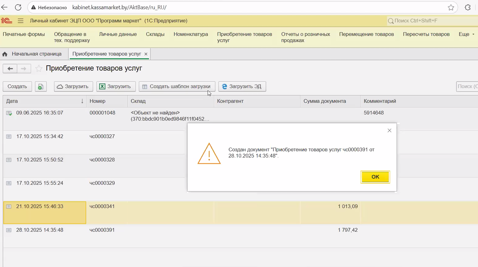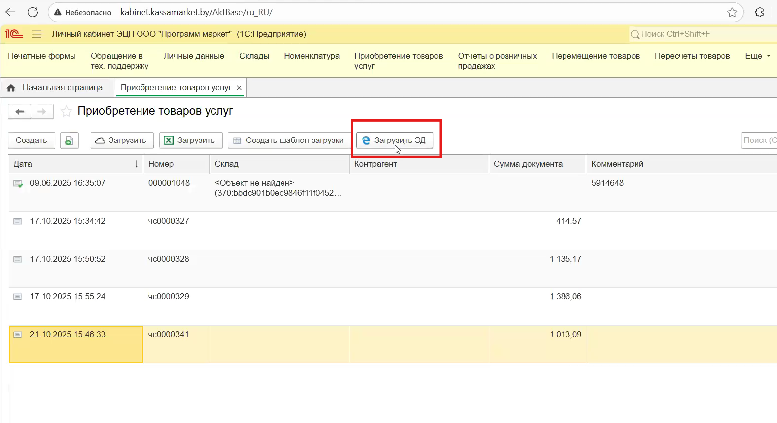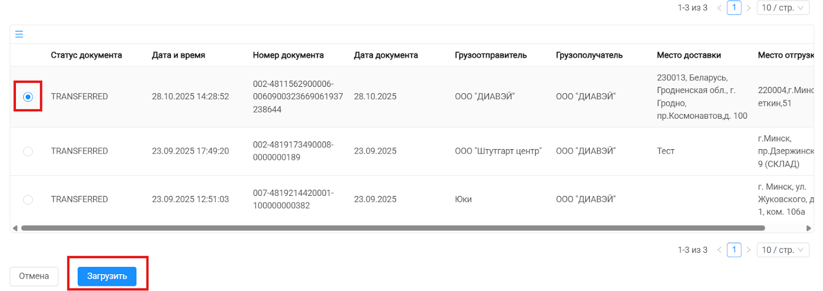- Отфильтровать накладные, выбрать нужную и нажать на кнопку “Загрузить”
