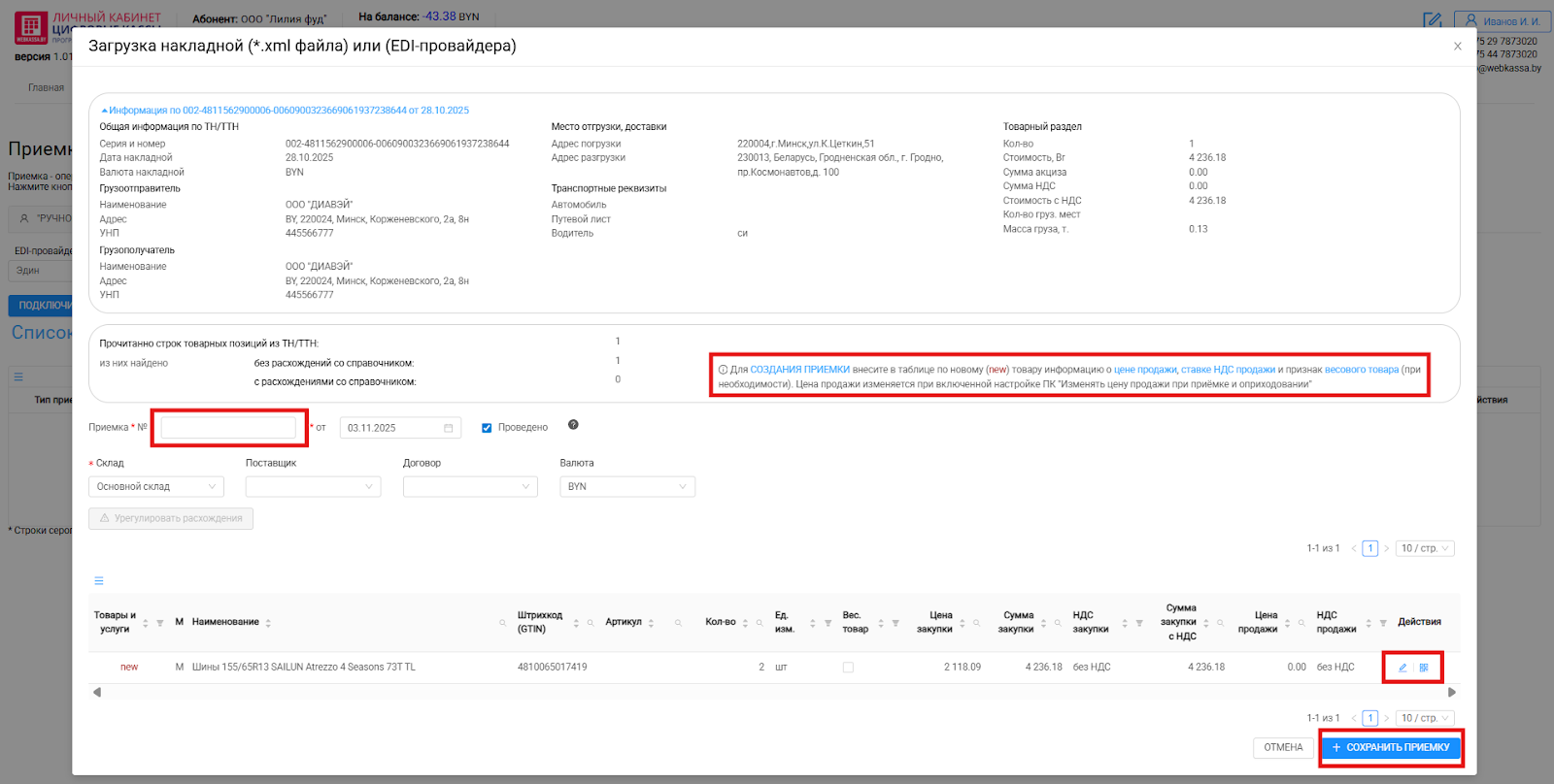 - Проведите приемку. Подтвердите прием товара по выбранной накладной. Данные о товарах (названия, цена закупки, коды маркировки) автоматически попадут в ваш товарный каталог.