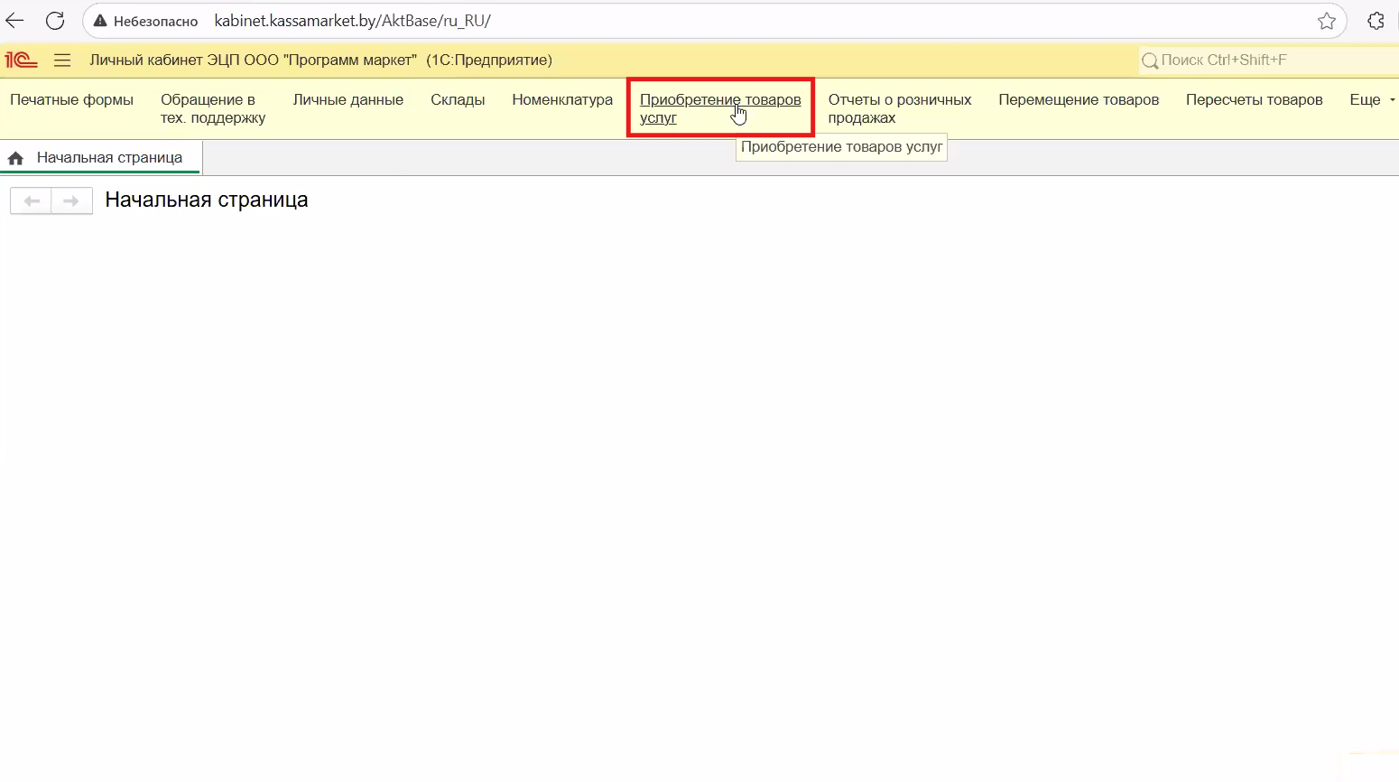 - Перейдите в раздел, отвечающий за приемку товаров и формирование товарного каталога («Приобретение товаров» у Flykassa и “Товарный учет” у Webkassa).