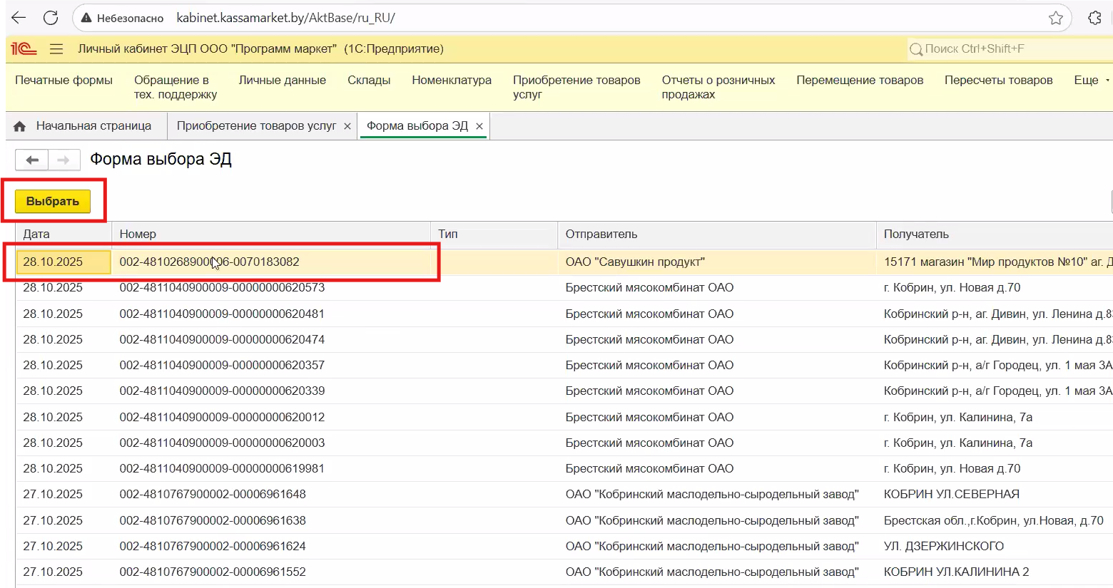 - Выберите накладную. В списке доступных документов отфильтруйте накладные от ЭДиН и выберите ту, по которой хотите провести приемку.