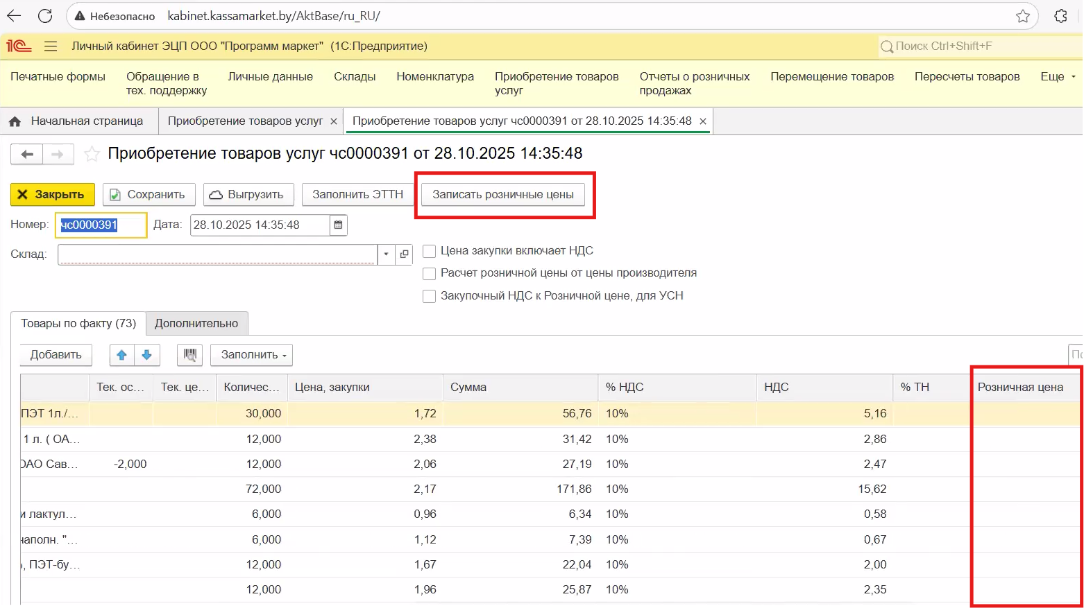 В документе пользователь может установить и записать розничные цены по отдельным товарным позициям.