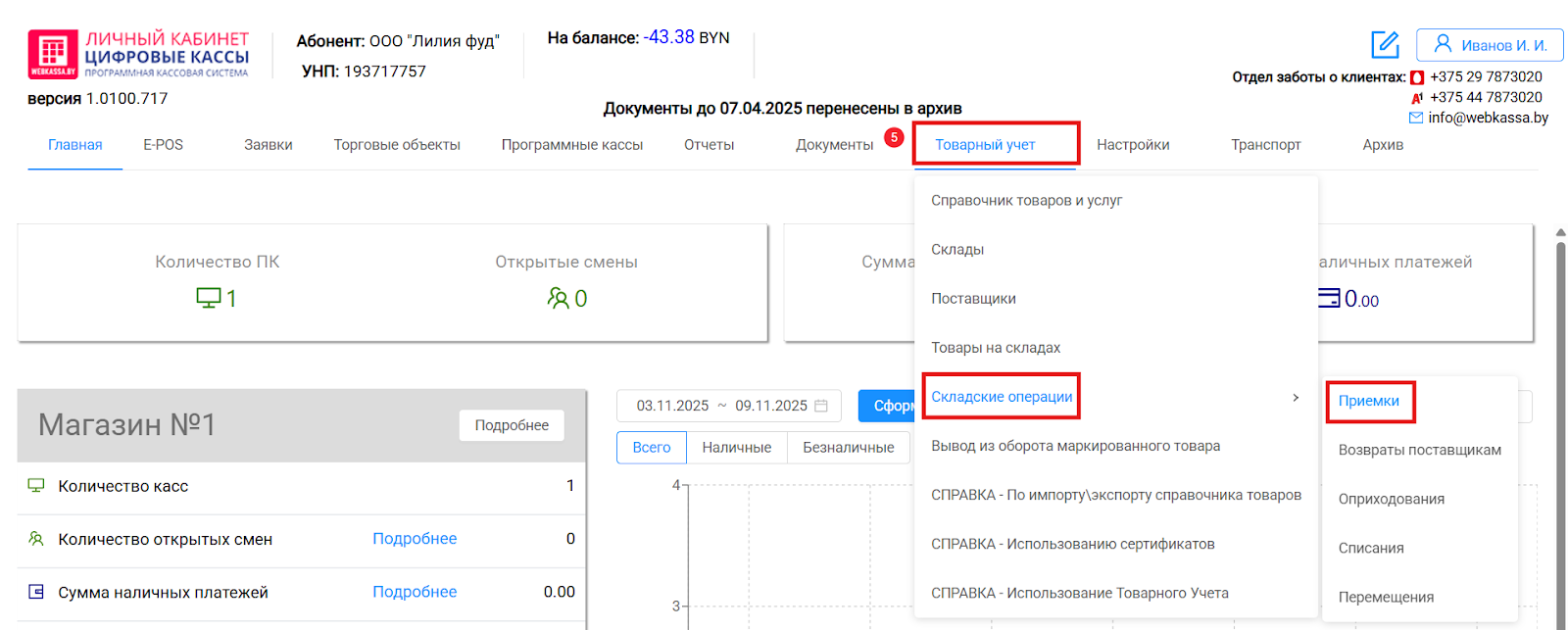 - Перейти в раздел Товарный учет > Складские операции > Приемки.