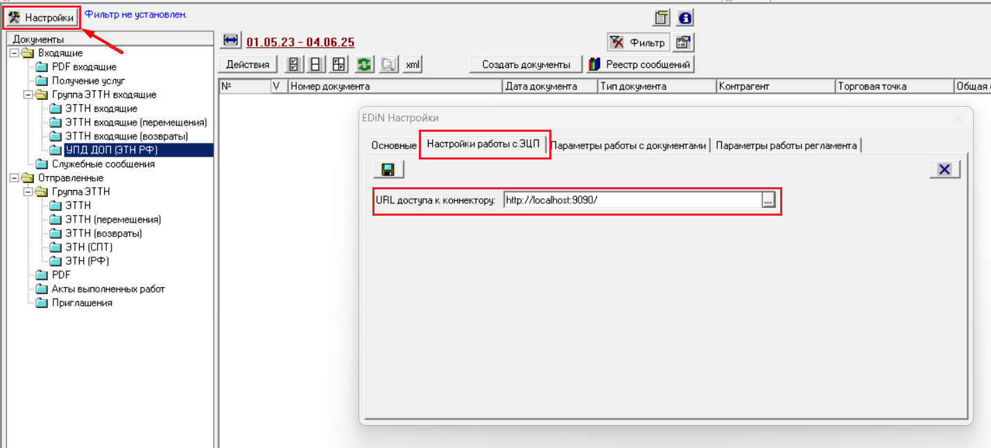 Для работы с накладными ТЭДО используется служба прокси-сервиса Docudrive. Она настраивается во вкладке Прокси-сервис. Так же настраивается служба транспорта во вкладке “Соединения”. Подробно настройка службы транспорта описана в инструкции