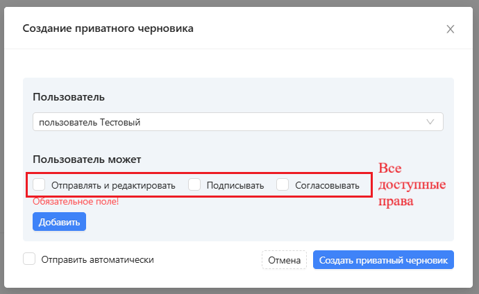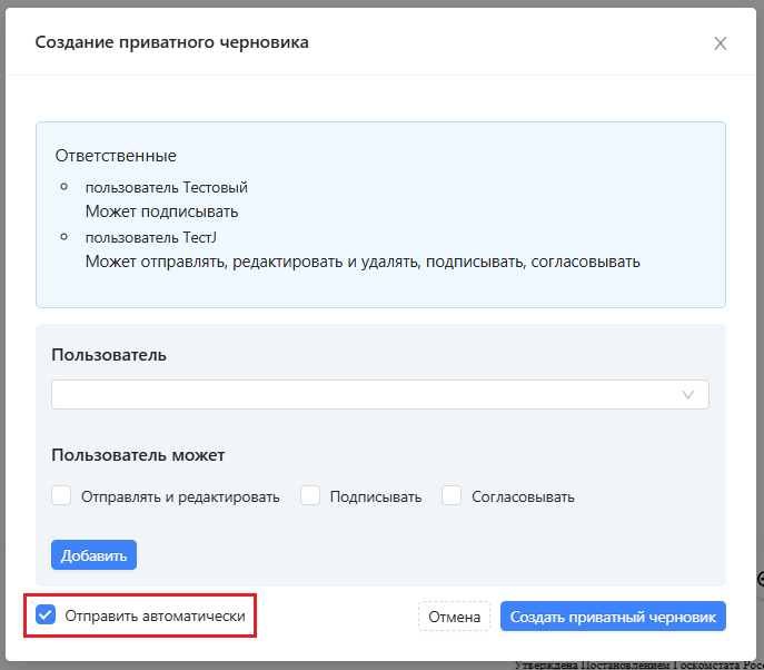 - Если при создании черновика установить галочку напротив пункта “Отправить автоматически”, черновик автоматически выгрузится на платформу после получения последней подписи. Наличие права “Отправлять и редактировать” у других пользователей на это не влияет.