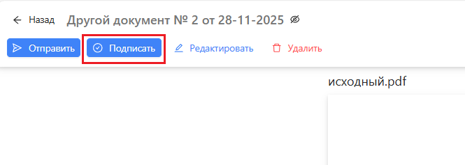 - Если информация в черновике корректная, можно подписать его от имени первого пользователя, используя приложение (утилиту) "ЭДиН: Электронная подпись" либо мобильную ЭЦП. Для этого надо нажать "Подписать" в верхнем левом углу документа, после чего выбрать подходящий способ подписи. Далее его подписывают все остальные пользователи, чьи подписи должны быть на документе (таким же образом).