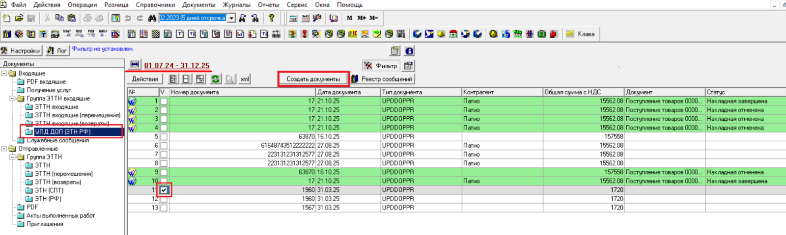Накладные, отправленные грузоотправителем-нерезидентом, попадают на ветку "Входящие->Группа ЭТТН входящие->УПД ДОП (ЭТН РФ)". Для отображения входящих накладных необходимо выбрать период, найти нужную накладную, отметить её галочкой и нажать кнопку "Создать документы". В колонке "Документ" отобразится номер созданного документа. Если в накладной передан новый товар, перед созданием документа необходимо добавить в справочнике 1с соответствующую номенклатуру для передаваемого GTIN.