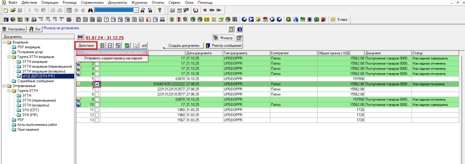 Для того чтобы подтвердить получение накладной, необходимо выбрать документ (отметить его галочкой), затем нажать "Действия" ->"Отправить подтверждение накладной". Будет выгружен ответ с кодом 11 (тип служебного сообщения UPDDOPPOK)