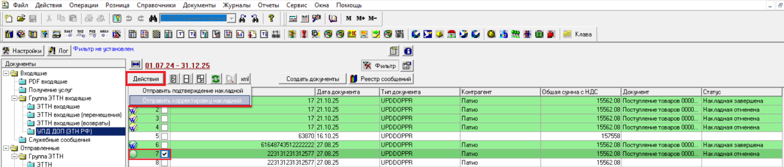 Отменить накладную со стороны получателя можно только до подписания документа (до отправки служебного сообщения UPDDOPPOK с кодом 11). Для отправки отмены необходимо найти успешно созданный документ, на ветке "Входящие->Группа ЭТТН входящие->УПД ДОП (ЭТН РФ)", нажать на кнопку "Действия" и выбрать "Отправить корректировку накладной".