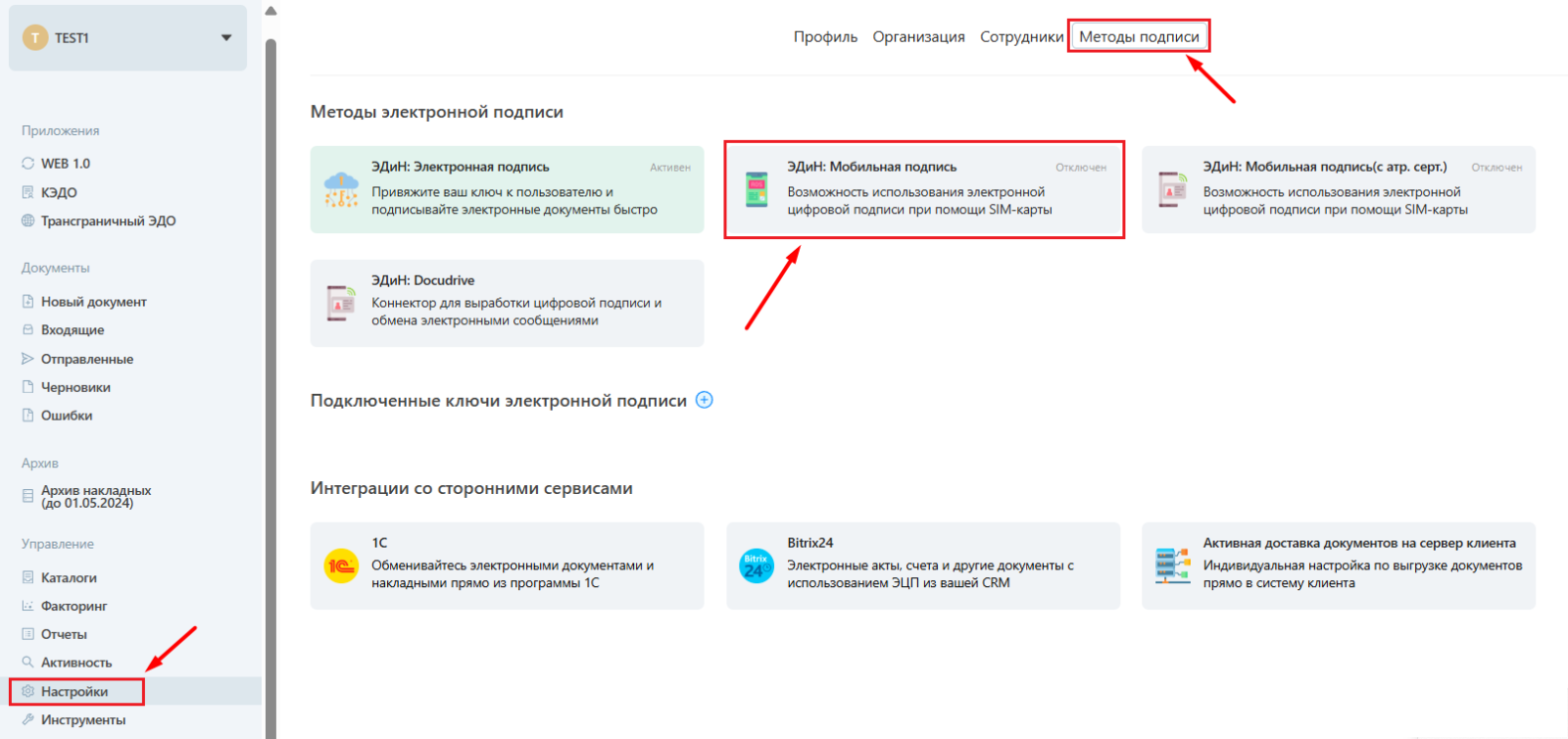 1. Для настройки возможности выработки ЭЦП с помощью мобильного телефона и специальной SIM-карты, необходимо зайти в личный кабинет и перейти на вкладку "Настройки" - "Методы подписи". Далее выбрать способ подписи "ЭДиН: Мобильная подпись".